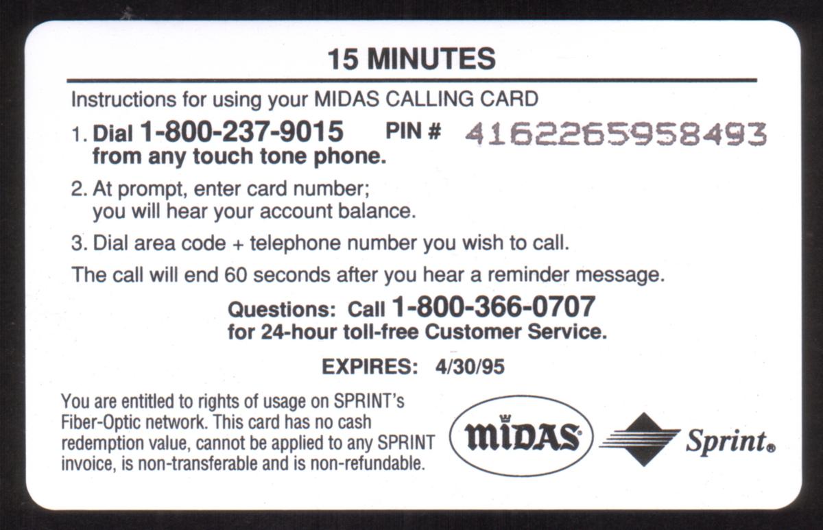 This card is consistent with the SKU-31761 keywords: it represents a promotional phone card linked with the Midas Muffler brand, highlighting roads, highways, power lines, trees, and sunsets. The card is no longer valid as it mentions an expiration date of 4/30/95. Sprint is also referenced, indicating a telecommunications affiliation.