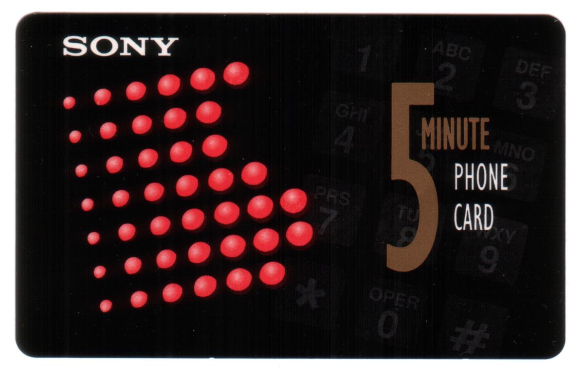 This Sony phone card is designed for five minutes of telephone use, making it a collectible item that reflects both functional value and a distinctive style with its red dot arrow and minimalist yet bold typography.