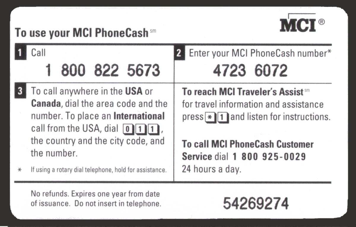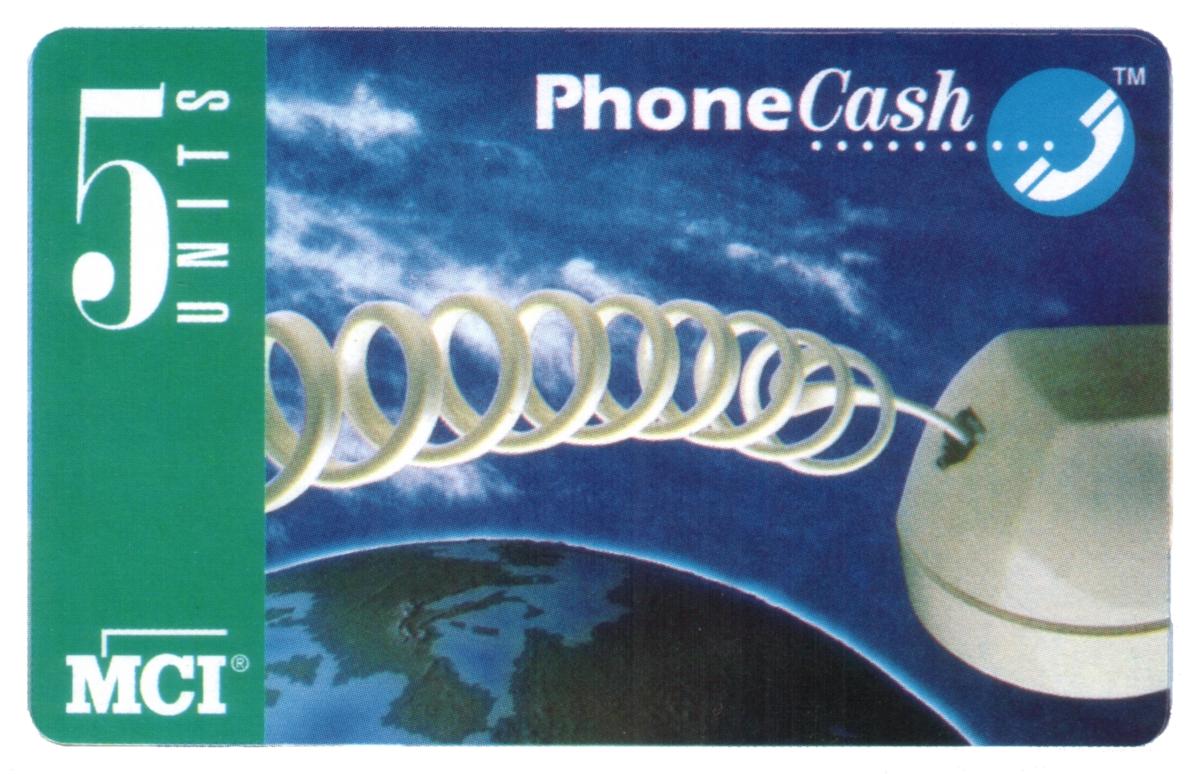This card represents the first MCI retail promotional giveaway for Phone Cash, combining the thematic imagery of global communication with MCI branding elements. The use of blue and green colors and the globe image underscore the worldwide connectivity concept tied to the phone service.