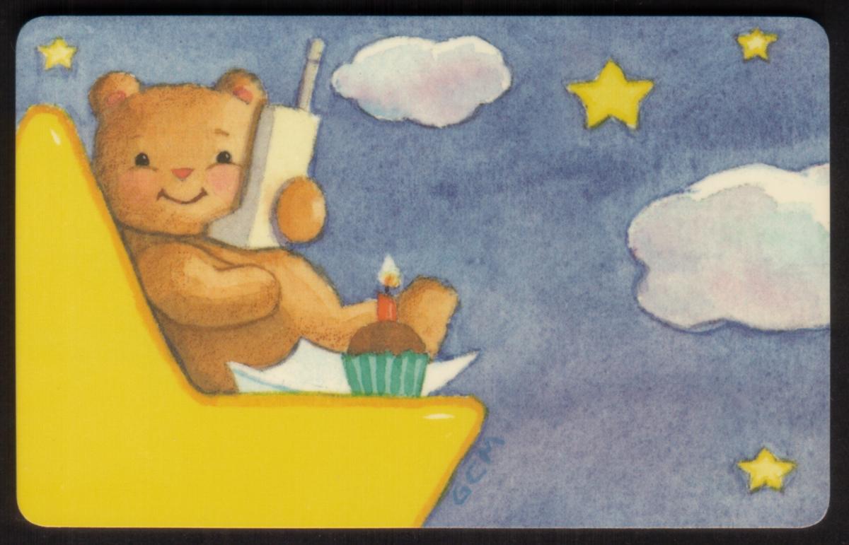 This collectible phone card features an illustration of a brown bear sitting comfortably in a chair, holding a cordless telephone to its ear. The bear’s posture and expression depict a relaxed and engaging moment. In front of the bear on a small table, there is a white cupcake with a single lit birthday candle, emphasizing a birthday celebration theme. The background of the card is dark blue with scattered stars and clouds, creating a nighttime sky effect.