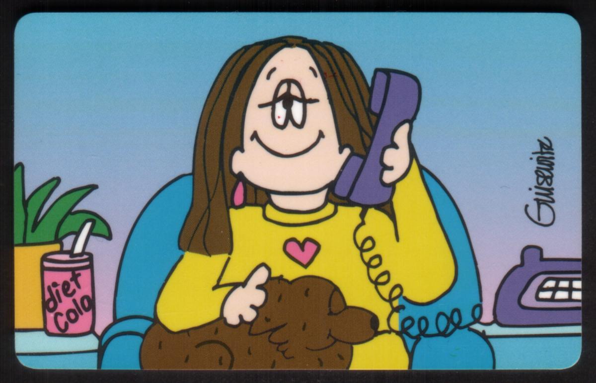 This collectible phone card features a cartoon illustration of Cathy, a well-known comic character created by Cathy Guisewite. Cathy is depicted sitting comfortably in a blue armchair, holding a purple corded telephone receiver to her ear with her right hand. She wears a yellow long-sleeve shirt adorned with a pink heart on the chest. Her brown hair falls past her shoulders, and she has a broad, cheerful smile.
