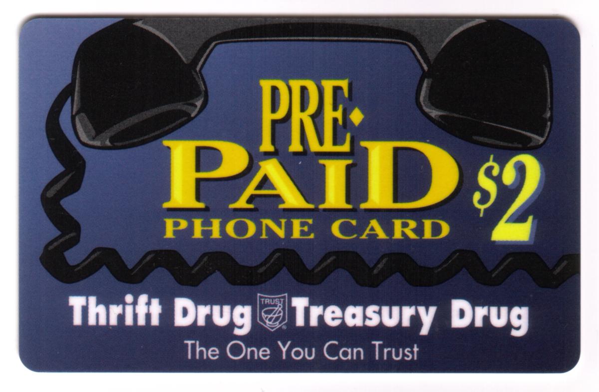This is a prepaid phone card with a $2 value. The card features the branding for Thrift Drug and Treasury Drug, two drug store chains. The text on the card reads "Thrift Drug Treasury Drug" with a small emblem between the two names. Beneath this, the slogan "The One You Can Trust" is displayed. The background color of the card is primarily blue, with bold yellow text at the top stating "PRE-PAID $2 PHONE CARD."