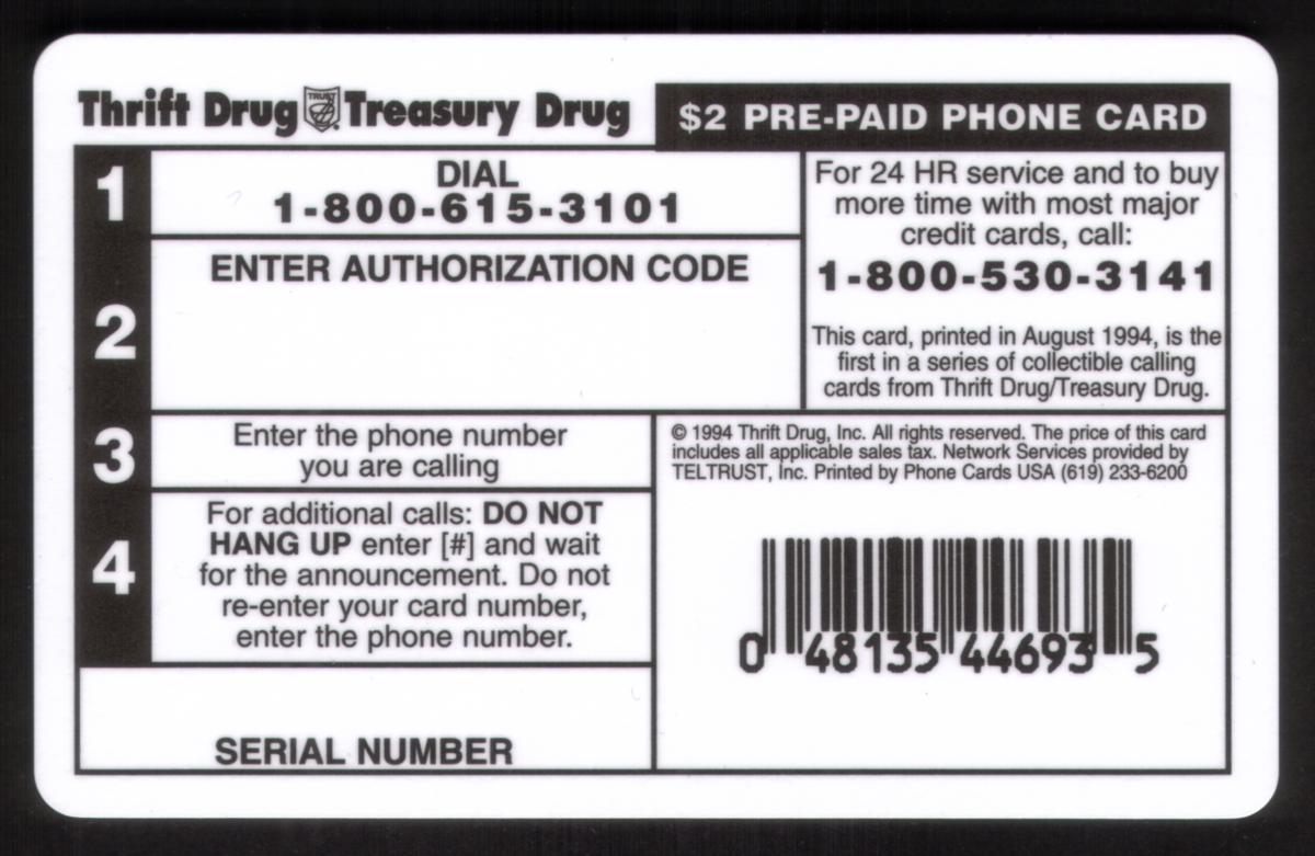 The design includes a black telephone handset graphic at the top corners, connected by a black curly cord stretching across the card just beneath the main yellow text. The phone and cord imagery reinforces the card’s use for telephone service. The layout and typography give the card a straightforward and easily readable appearance intended for marketing the phone card in conjunction with the Thrift Drug and Treasury Drug stores.