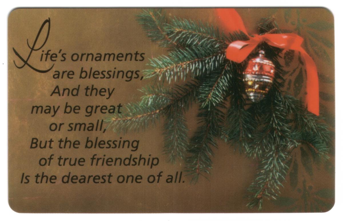On the left side of the card, a seasonal message is elegantly printed in black script. It reads: "Life’s ornaments are blessings, And they may be great or small, But the blessing of true friendship Is the dearest one of all." The overall design combines heartfelt sentiment with classic Christmas imagery reflecting the spirit of friendship and holiday warmth.