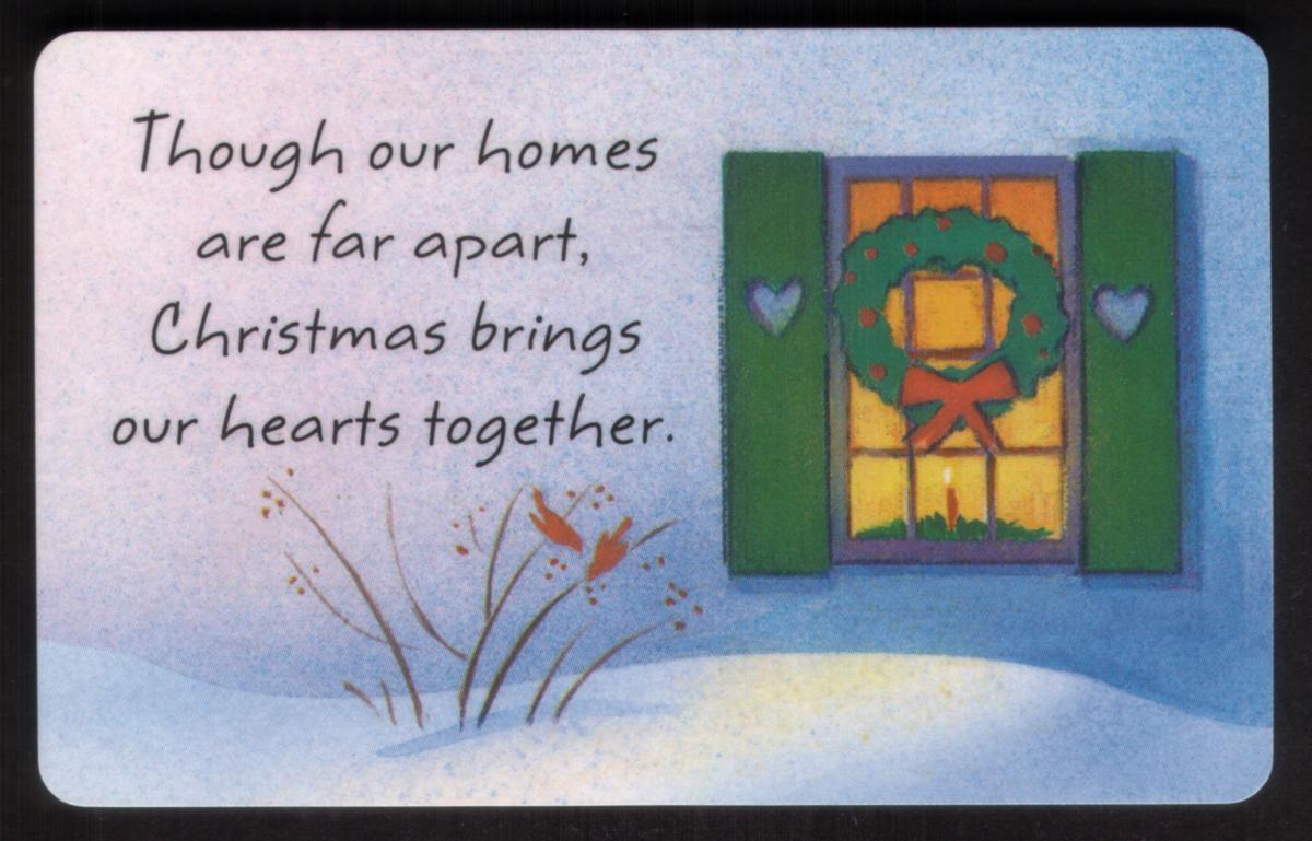 This collectible card features a Christmas holiday theme with the phrase "Though our homes are far apart, Christmas brings our hearts together." prominently displayed in black script on a softly shaded blue and white snowy background. To the right, there is an illustration of a warmly lit window with green shutters. The shutters each have a heart-shaped cutout near the top. The window displays a green Christmas wreath adorned with red berries and a large red bow.