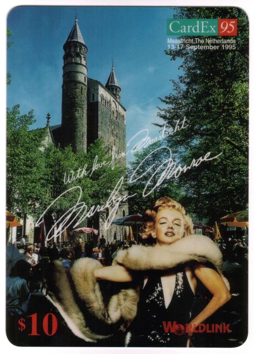 This collectible belongs to a series connected to entertainment, famous people, and celebrities, specifically highlighting Marilyn Monroe. It is a WorldLink phone card issued for the CardEx ’95 event held in Maastricht. The card’s design merges iconic Hollywood glamour with a prominent Dutch landmark, creating a unique collectible piece for fans of classic film stars and international phone card collections.