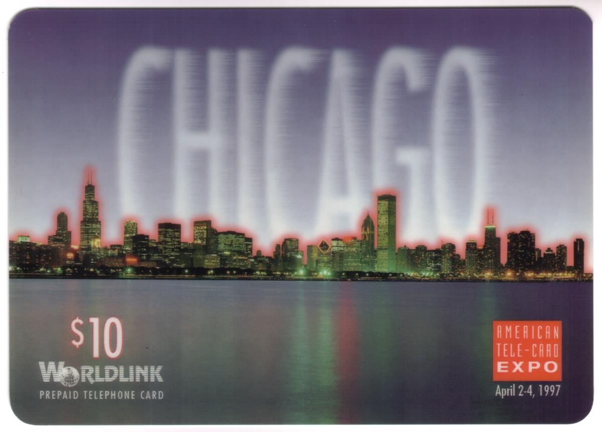 This card is part of the WorldLink Communications series issued for the American Tele-Card Expo held in Chicago in April 1997. It is a jumbo size collectible telecard reflecting an event-related theme focused on the major Illinois city skyline.