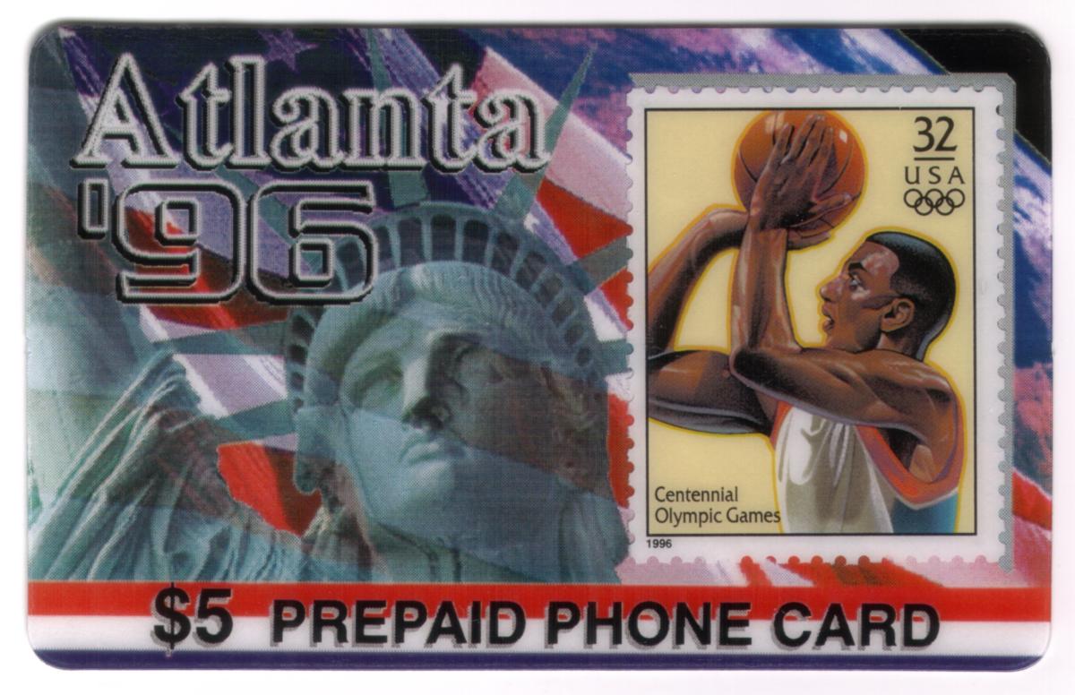 The card includes clear text stating "Atlanta 1996 Olympics" and highlights "Men’s Basketball" along with a "$5" value indicator, confirming its association with both the Olympic Games and collectible sports memorabilia categories. The branding "Tell-One Inc." is visible, indicating the issuing entity of the card. Additional printed text reads “centennial olympic games,” “atlanta georgia 1996,” and “sports: olympics | sports: basketball,” all reinforcing the card’s theme and context within global Olympic sports history.