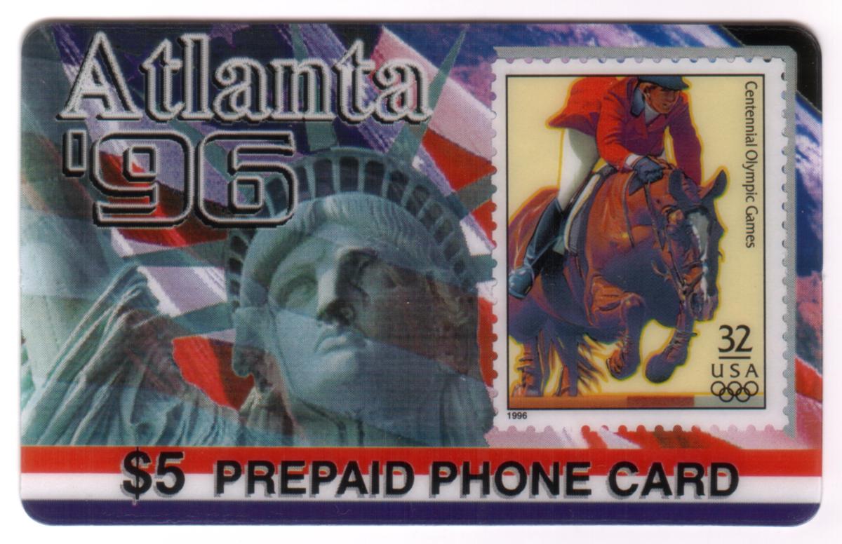 The overall color scheme includes natural tones reflecting the horse and rider, as well as Olympic-related branding colors. The combination of postal stamp, Olympic rings, and equestrian sports imagery underscores the celebration of the Centennial Olympic Games with a focus on horse-related competition. This collectible represents a specific moment in Olympic history and commemorates Atlanta’s role as host city in 1996.