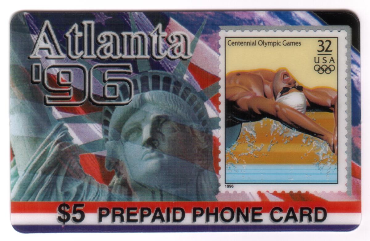 Prominently displayed on the card are several textual elements: “$5” indicating the card’s value, “Atlanta 1996 Olympics,” and “32c USPS Postage Stamp.” These details connect the card to the official postage and collectible memorabilia issued in honor of the Olympic Games. The words “centennial olympic games” are also included, along with the identification of the sport: “sports: swimming backstroke” and “men’s swimming.”
