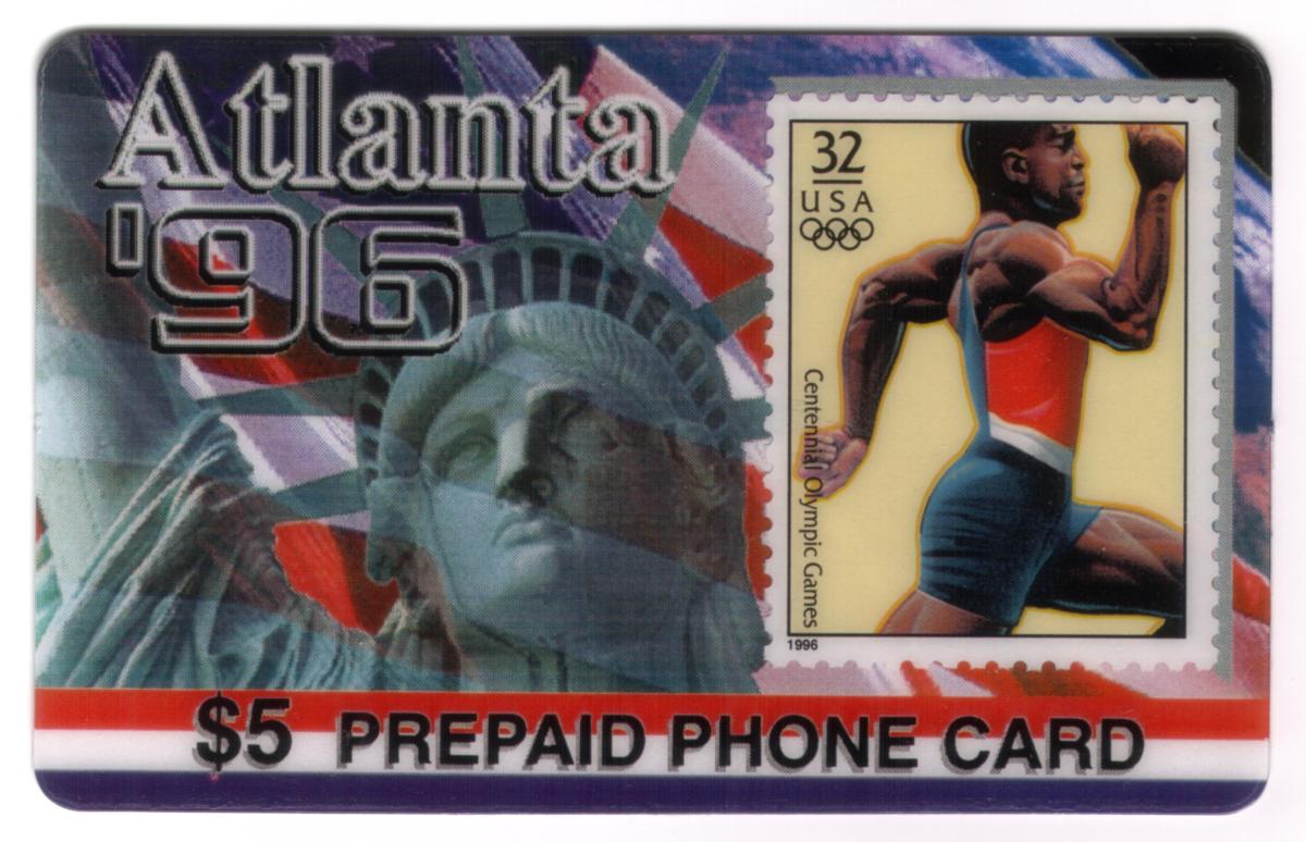 The card includes a $5 denomination indicated by a blue square with a white "$5" on the lower left corner. Text on the card reads “Atlanta 1996 Olympics 32c USPS Postage Stamp - Men's Sprinting,” indicating the theme is centered on Olympic sprinting and postage collectibles. The word "Tell-One Inc." and the USPS mark appear below the denomination, identifying the issuer or producer.