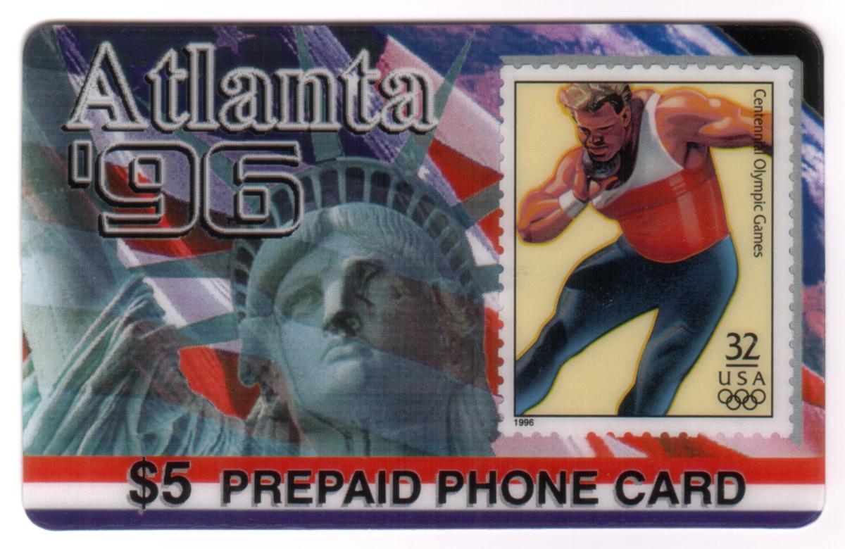 The card includes branding from Tell-One Inc., which appears in the text at the bottom alongside the stamp. The denomination "$5" is indicated, linking the card to collectible or monetary value connected with the Olympics. Overall, this item serves as a tribute to the 1996 Atlanta Olympic Games and commemorates the men’s shot put event through official USPS postage and specialized collectible design.