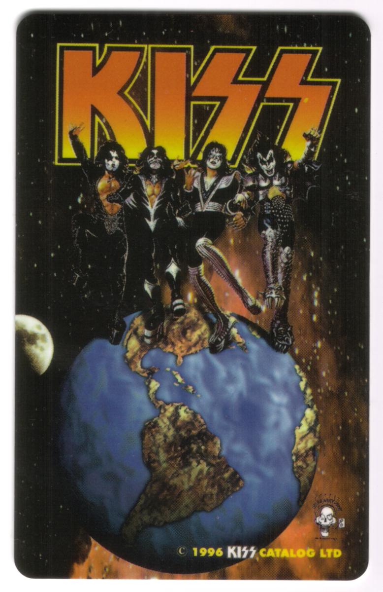 This collectible phone card features the iconic rock band KISS standing on top of a detailed depiction of planet Earth, focusing on the continents of North and South America. The four band members are shown in their signature stage costumes and makeup, each striking a dynamic pose. The background is a starry space scene with the moon visible on the left side of the card.