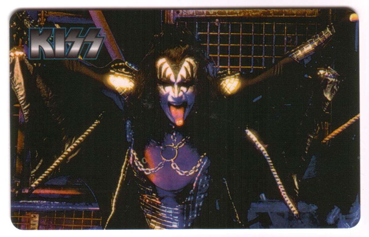 This collectible phone card features a vibrant image of Gene Simmons, the iconic bassist and co-lead singer of the rock band KISS, on stage. Gene Simmons is shown wearing his famous demon makeup, characterized by white and black face paint with bold patterns around his eyes and mouth. His mouth is open with his long tongue extended, a signature move that is instantly recognizable. He is dressed in an elaborate stage costume with metallic details that catch the light, including large shoulder pads and chains that drape across his chest.
