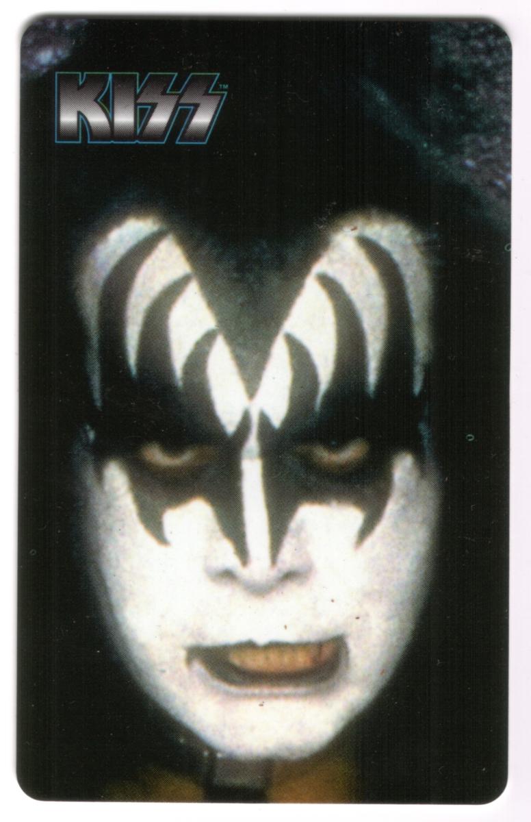 This collectible phone card features a close-up image of Gene Simmons, the bass player and co-lead singer of the rock band KISS. Simmons is shown wearing his iconic black and white "Demon" makeup with sharply defined black patterns sweeping from his eyes and nose area. His expression is intense and focused, complementing the dark background that emphasizes his facial features and makeup.