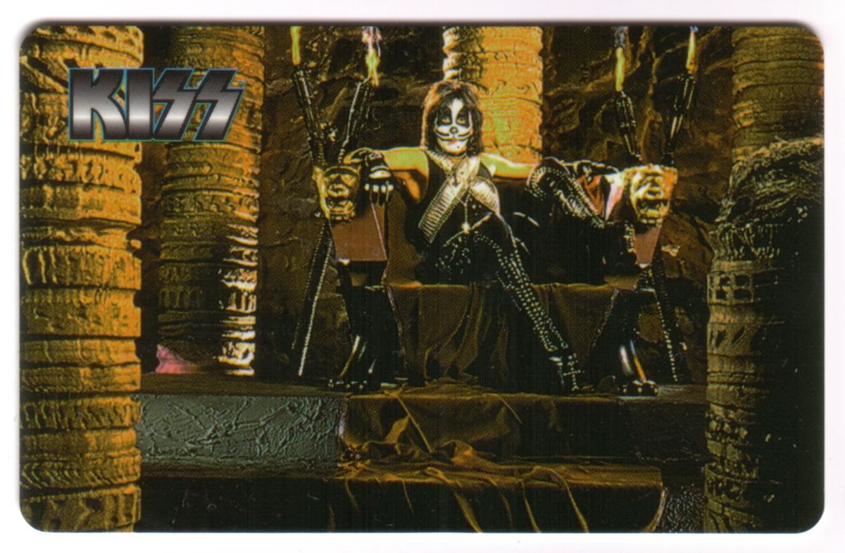 This collectible phone card features Peter Criss, drummer of the rock band KISS, sitting on a throne-like chair on stage. He is wearing his iconic "Catman" makeup and costume, complete with black studded leather pants and arm bands. The setting appears theatrical with ancient, temple-like stone pillars and detailed carvings creating a dramatic atmosphere. The lighting emphasizes the dark, mysterious ambiance of the scene.