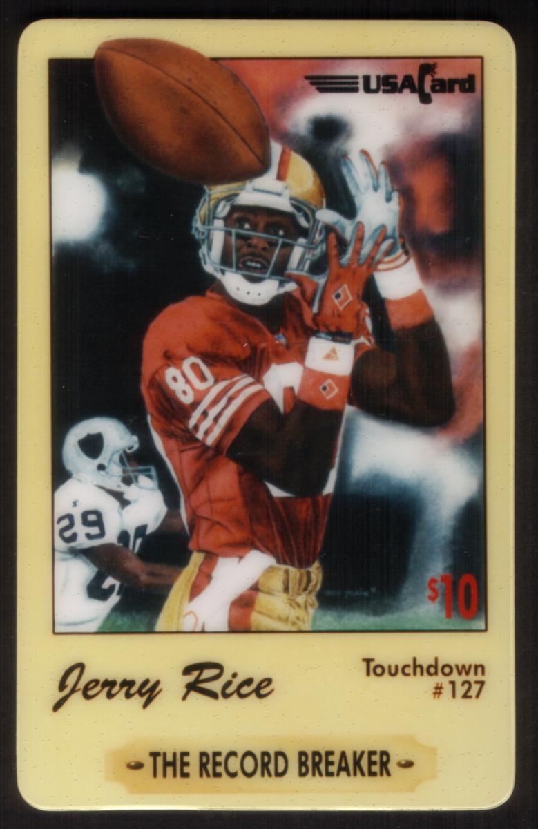 This card is connected to the National Football League (NFL) and relates specifically to sports collectibles focusing on football, touchdowns, and football records. It commemorates Jerry Rice’s record-setting touchdown as part of the San Francisco 49ers team.