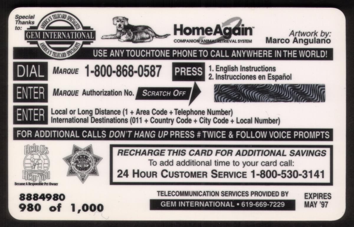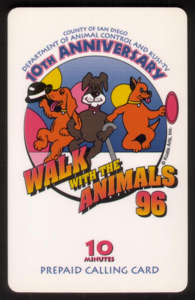 This prepaid calling card commemorates the 10th anniversary of the "Walk With The Animals" event held in 1996. It was issued by the County of San Diego Department of Animal Control in partnership with KUSI-TV. The card’s design features colorful, cartoon-style artwork by Marco Angulano, depicting three cheerful dogs engaged in playful activities: one dog wears a black hat and sunglasses, another stands smiling in the middle, and the third dog is catching a pink frisbee. Behind the dogs are stylized sun shapes in yellow and pink, set against a simple white background.