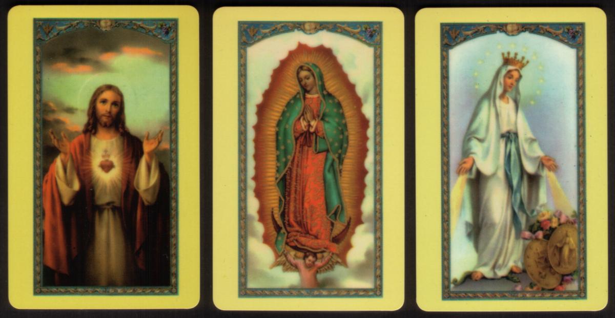 The second card portrays the Virgin of Guadalupe, known as Lady of Guadalupe, standing on a crescent moon held by an angel below. She wears a rose-colored gown and a green mantle covered with stars. A golden radiant halo surrounds her figure. The background is largely white, emphasizing her central image.
