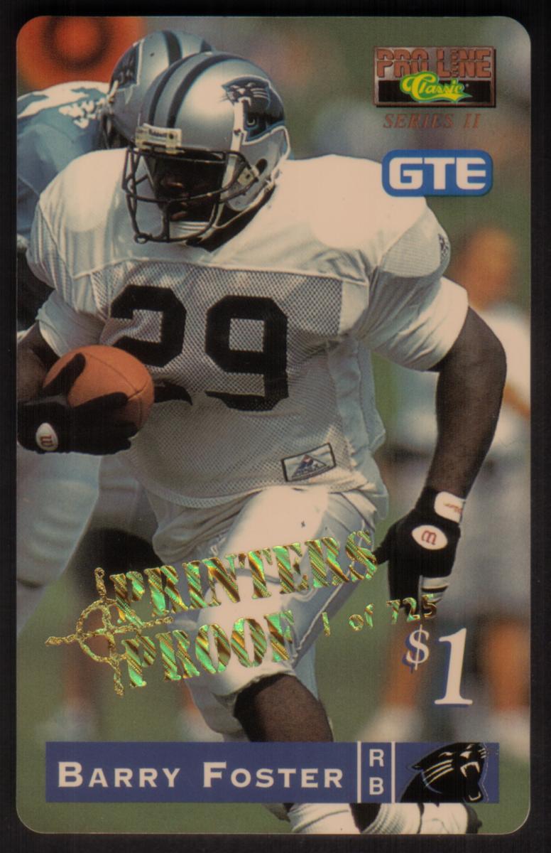 The card is identified as Proline 2, card number 2 out of a set of 30, and is marked as a Printer’s Proof edition. It is associated with The Score Board, a product line under GTE. The design includes "Barry Foster: Browns" prominently displayed alongside his player number and team name, emphasizing his role and contribution to the Browns.