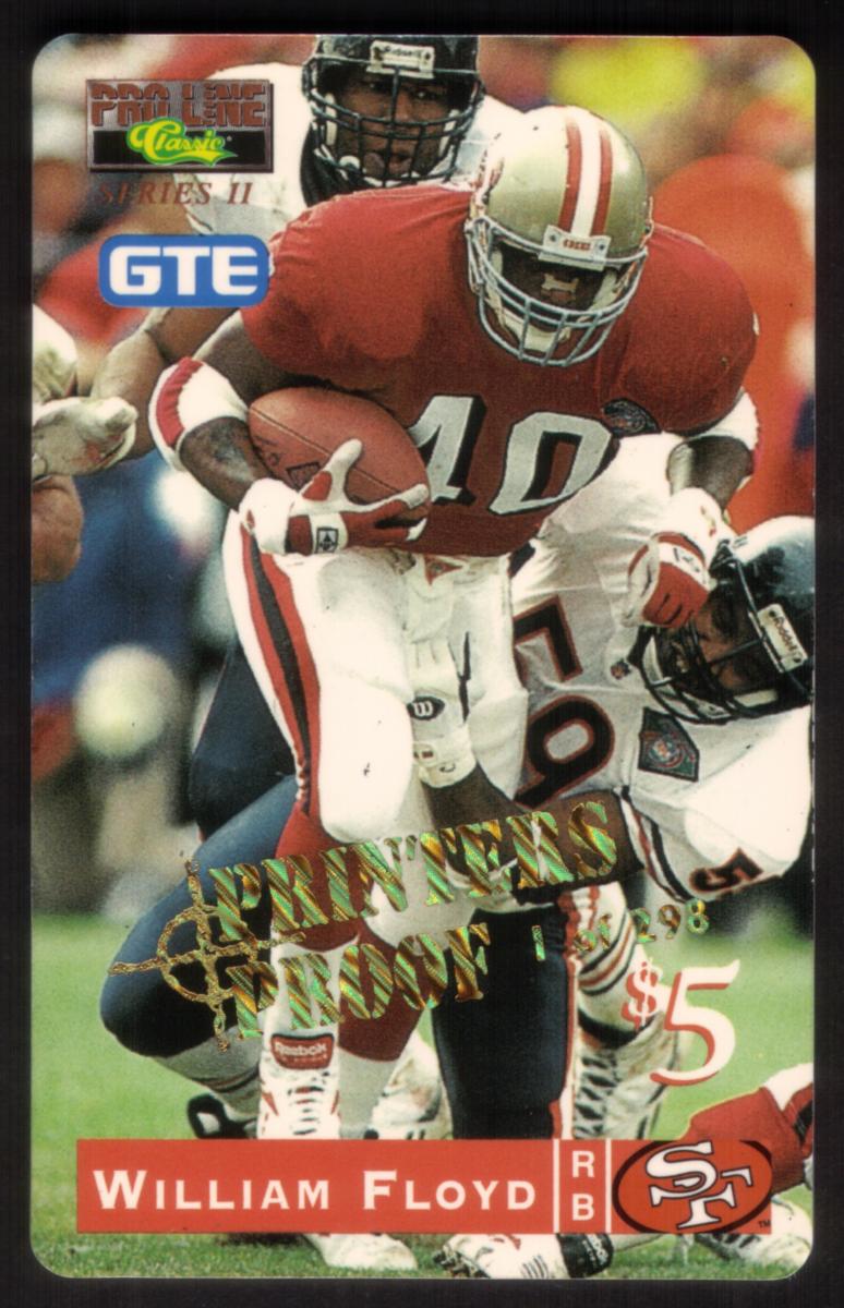 This collectible card features William Floyd, a professional football player, depicted in a dynamic action pose. William Floyd is shown in full football gear, including a helmet and uniform, emphasizing his role as a key player in the National Football League (NFL). The card situates him prominently against a sports-themed background that complements the football focus.