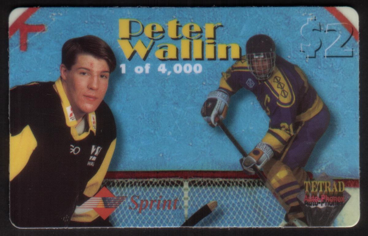 The card design incorporates the brand "Auto-Phonex" and is associated with Tetrad Hockey. The denomination "$2" is displayed on the card, showing its value. The Sprint logo is present, indicating the telecommunications company involved in this collectible. The layout uses a cool-toned background with a subtle ice rink texture enhancing the hockey theme. All text and imagery emphasize the sport of ice hockey and highlight Peter Wallin as the featured athlete.