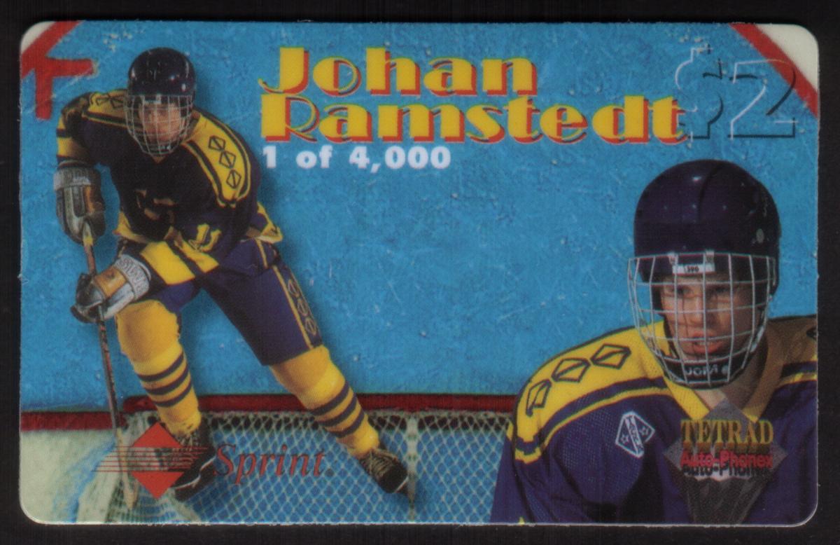 This collectible chip card features Johan Ramstedt, a professional ice hockey player, identified by his name and jersey number 50. The card is part of the Auto-Phonex Tetrad Hockey series and displays a clear, photographic image of him in action during a sprint moment on the ice. The design includes a $2 value designation prominently placed, reflecting its worth.