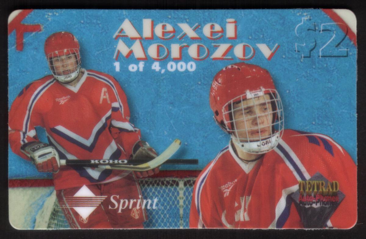 The card is designed for collectors interested in ice hockey and features accurate player identification and thematic design connected to the sport. The $2 value is indicated, aligning with the card’s collectible and practical use. The overall appearance captures the essence of professional ice hockey through a focused image of Alexei Morozov and related textual information.