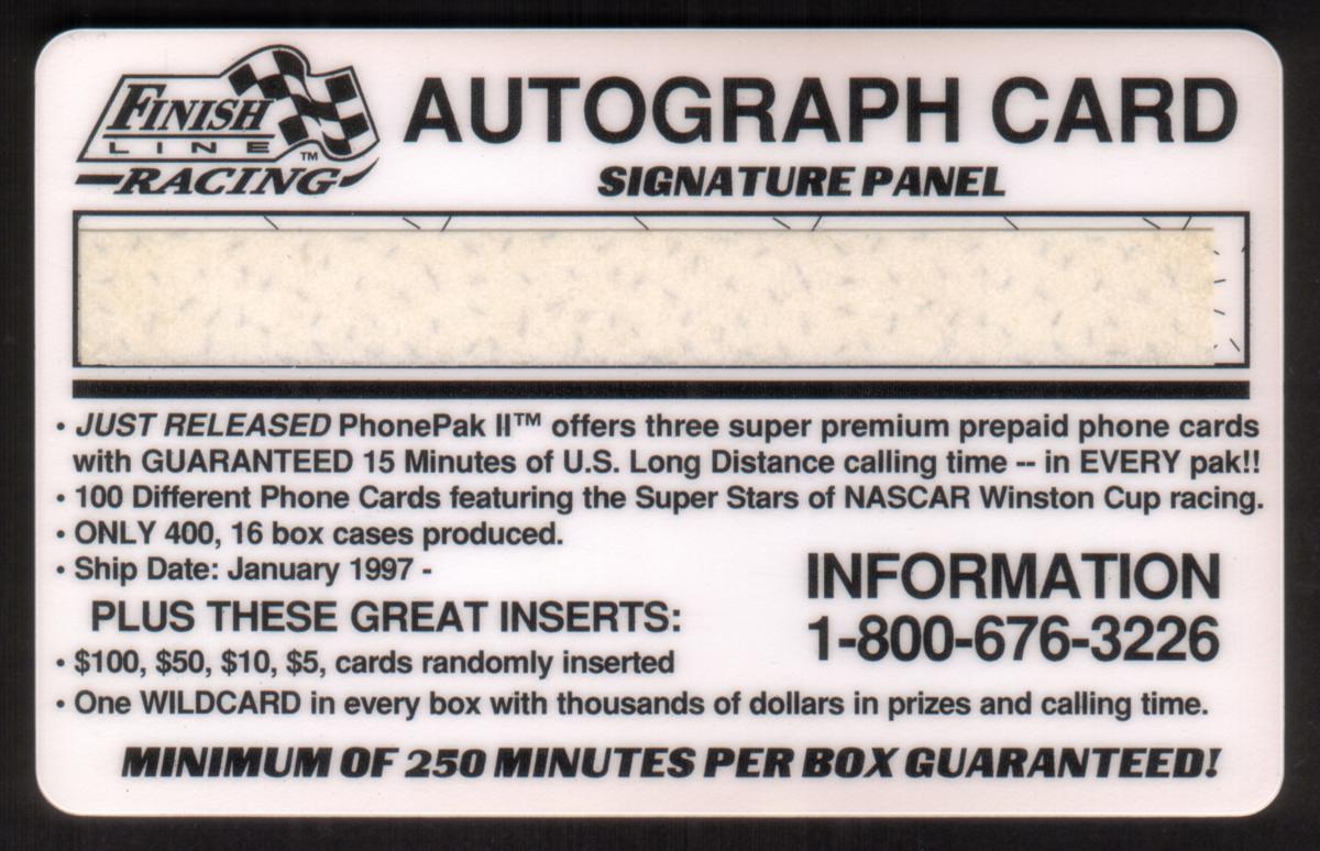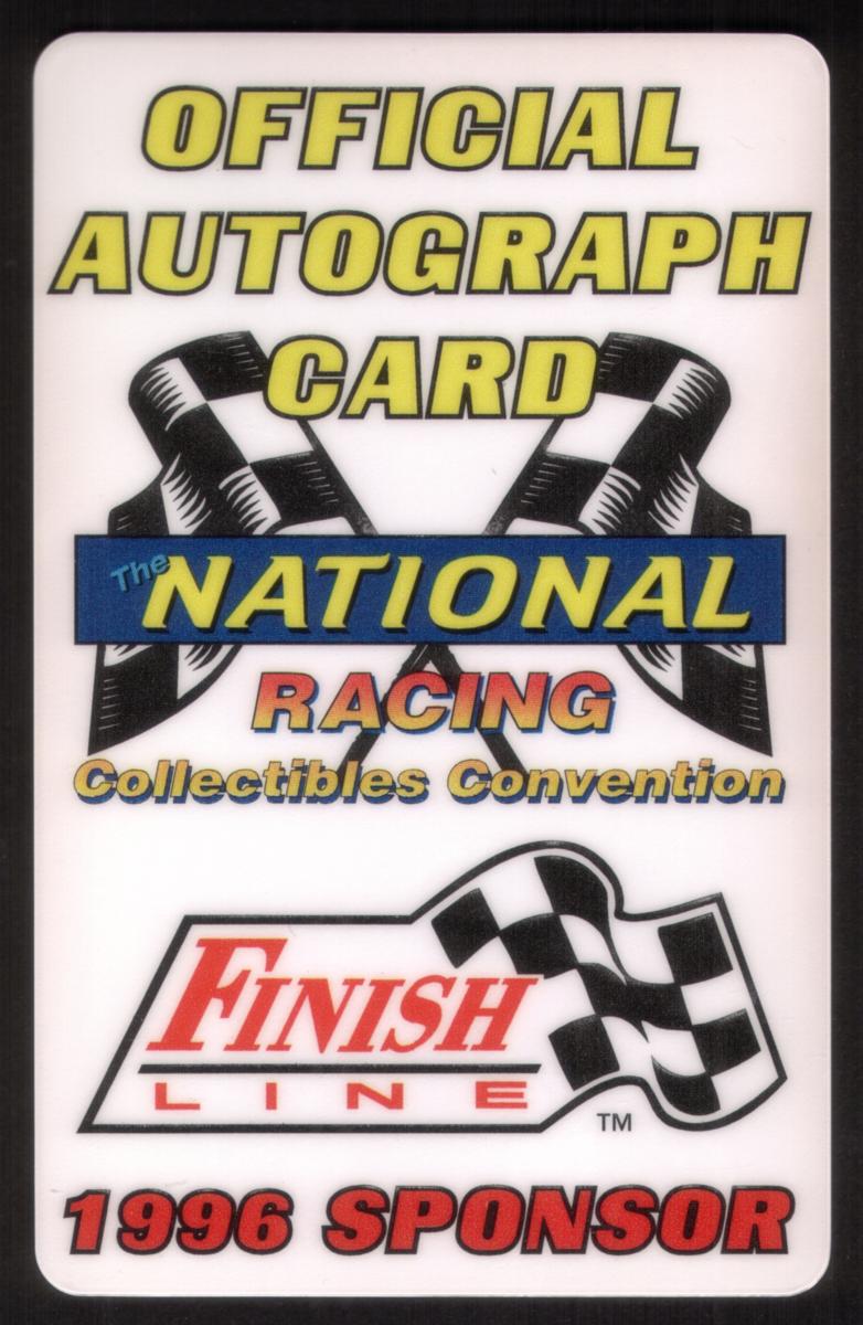 This collectible card is associated with Finish Line Racing and commemorates the 1996 National Racing Collectibles Convention, emphasizing its status as an official autograph card and sponsor memento.