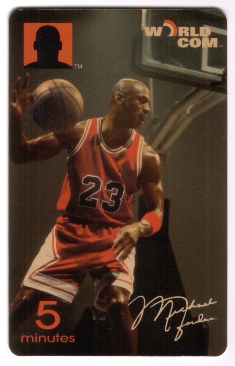 The card is marked with the text "5 minutes" in the lower-left corner, indicating its usage value. Michael Jordan's signature is printed in white near the bottom right corner of the card. The WorldCom logo appears in the top right area, indicating the card's association. The overall design highlights Michael Jordan's iconic status in basketball and combines sports imagery with telecommunications branding.