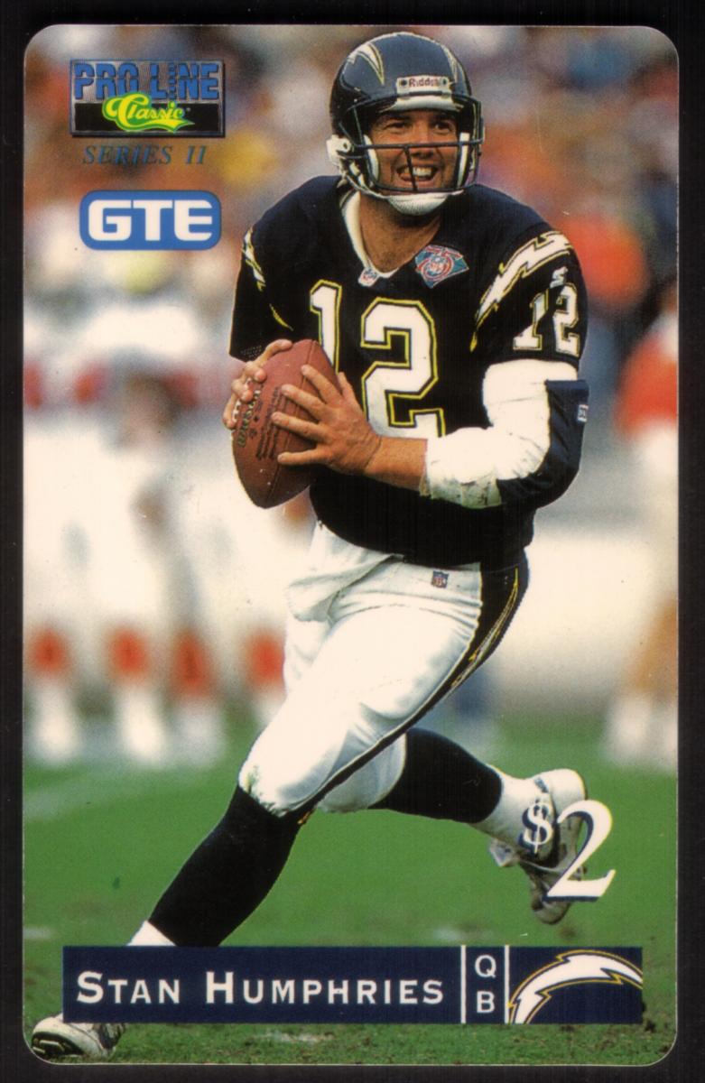This collectible phone card features Stan Humphries, quarterback for the NFL team San Diego Chargers. The card displays Humphries in full football uniform, wearing a black jersey with the number 12 prominently shown on the front, paired with white pants and black socks. He is captured in action, holding a football with both hands as he appears to be scanning the field, ready to pass.