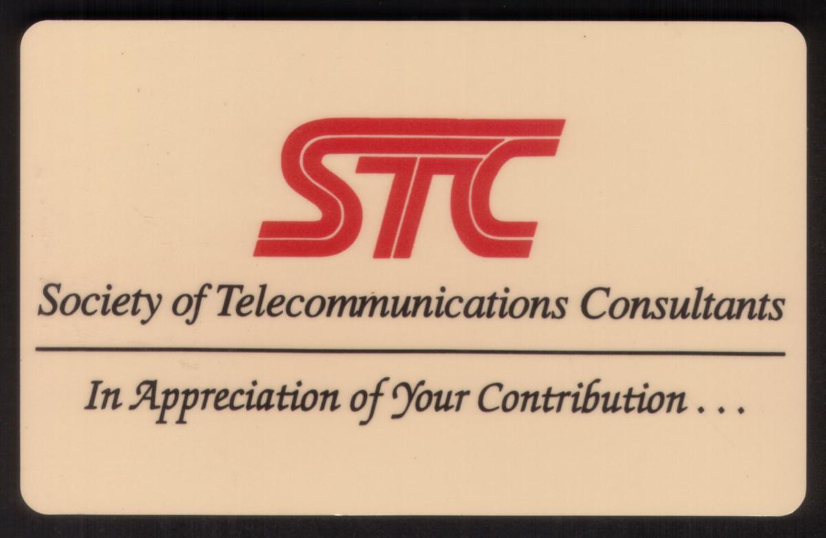 This collectible promotional phone card is issued by the Society of Telecommunications Consultants (California). It features a clean and simple design with a cream-colored background. At the top center is the bold, red STC logo, prominently displayed in large, stylized lettering.
