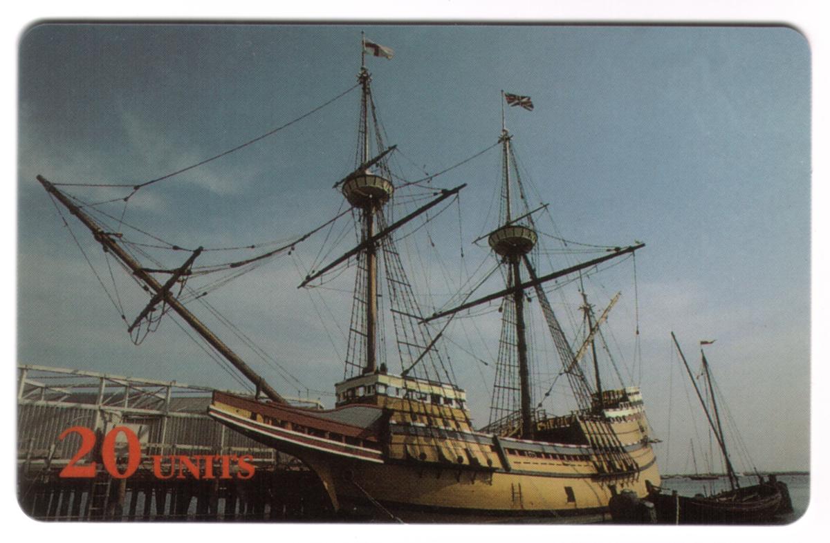 This collectible phone card features a detailed image of The Mayflower, the historic sailing ship famous for transporting the Pilgrims to America in 1620. The ship is shown docked at a wooden pier under a bright, clear sky. The Mayflower is depicted with its tall masts rigged with ropes and spars, highlighting classic 17th-century sailing ship design.