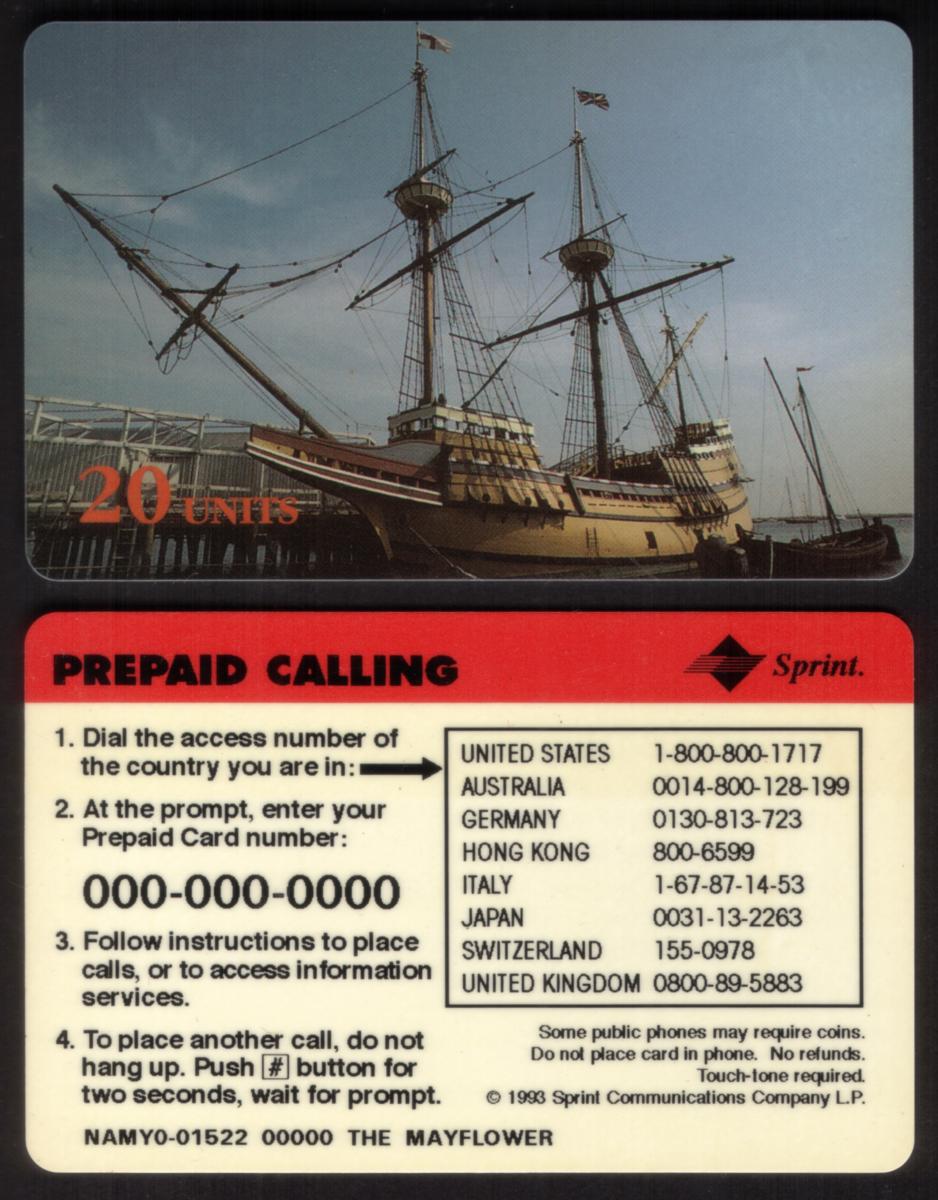 This card is marked as a specimen for Sprint and is part of a collection celebrating Americana, sailing, and sightseeing. It serves as a tribute to the historical significance of The Mayflower and its role in American history.