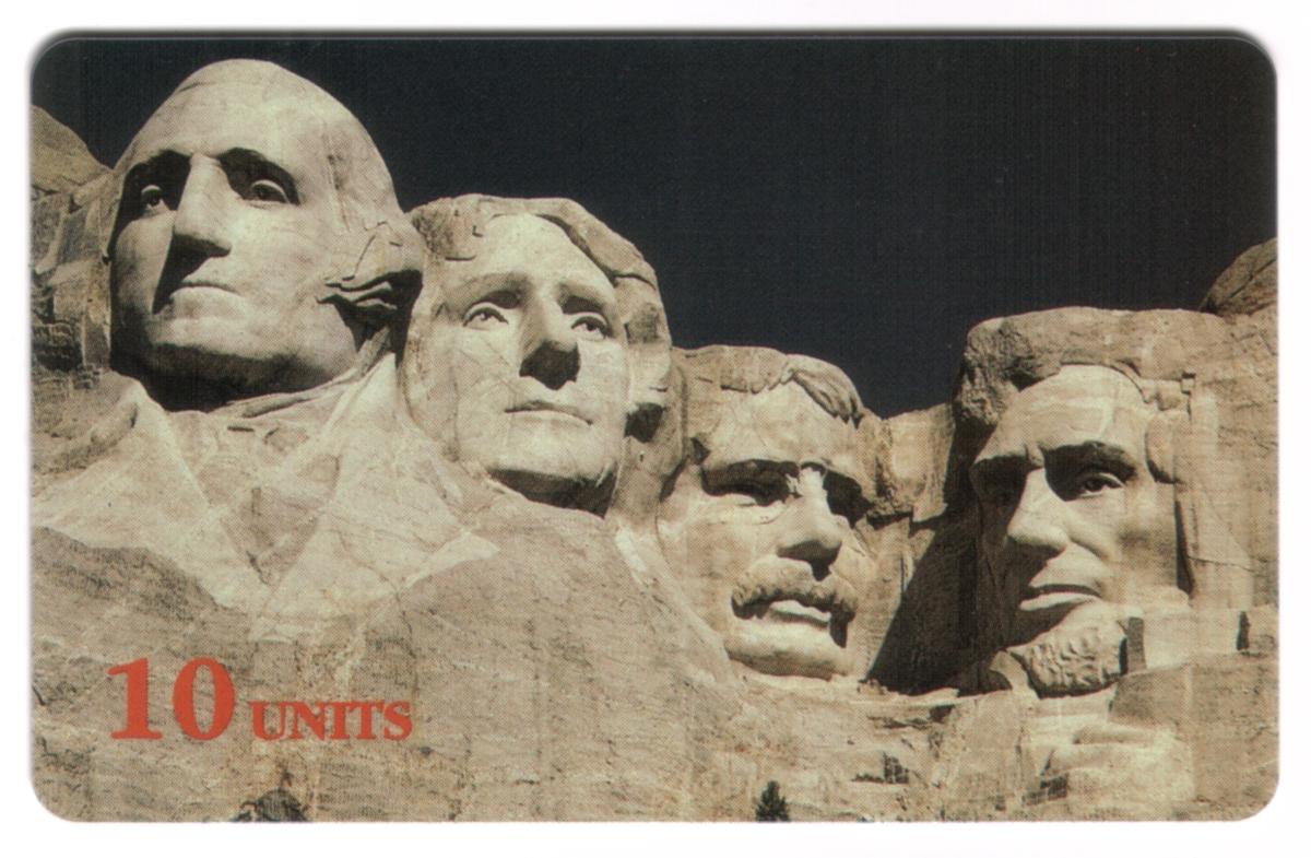This collectible phone card features a photographic image of Mount Rushmore National Memorial located in South Dakota, USA. The close-up view highlights the massive carved faces of four American presidents: George Washington, Thomas Jefferson, Theodore Roosevelt, and Abraham Lincoln. The detailed stone sculptures are shown under clear lighting, emphasizing the depth and texture of the monument.