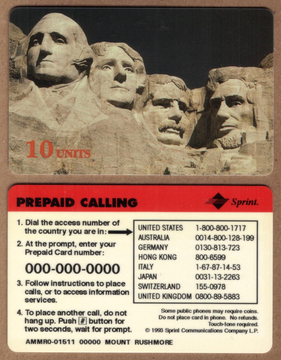 This card is designed for use with Sprint phone services in the USA and Australia, as noted in the accompanying information. It represents a piece of American historical landmarks and national memorials in collectible phone card form.
