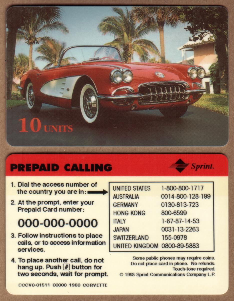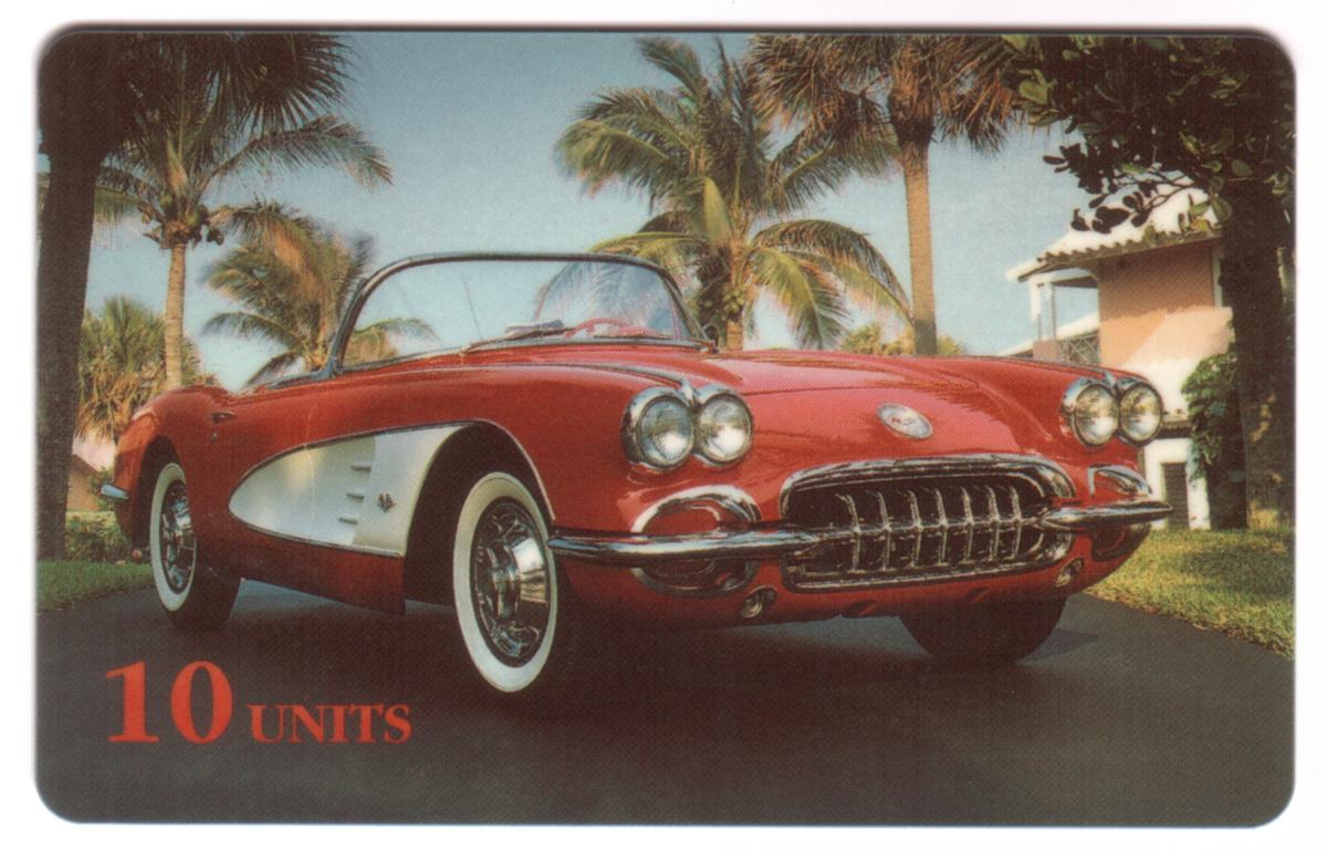 This collectible phone card features a vivid photographic image of a classic red 1960 Chevrolet Corvette convertible. The car is angled to the right, showing its distinctive front grille with chrome detailing, dual round headlights on each side, and whitewall tires with chrome hubcaps. The Corvette's side panel includes white accenting that contrasts with the vibrant red body, highlighting the car’s iconic 1960s design.