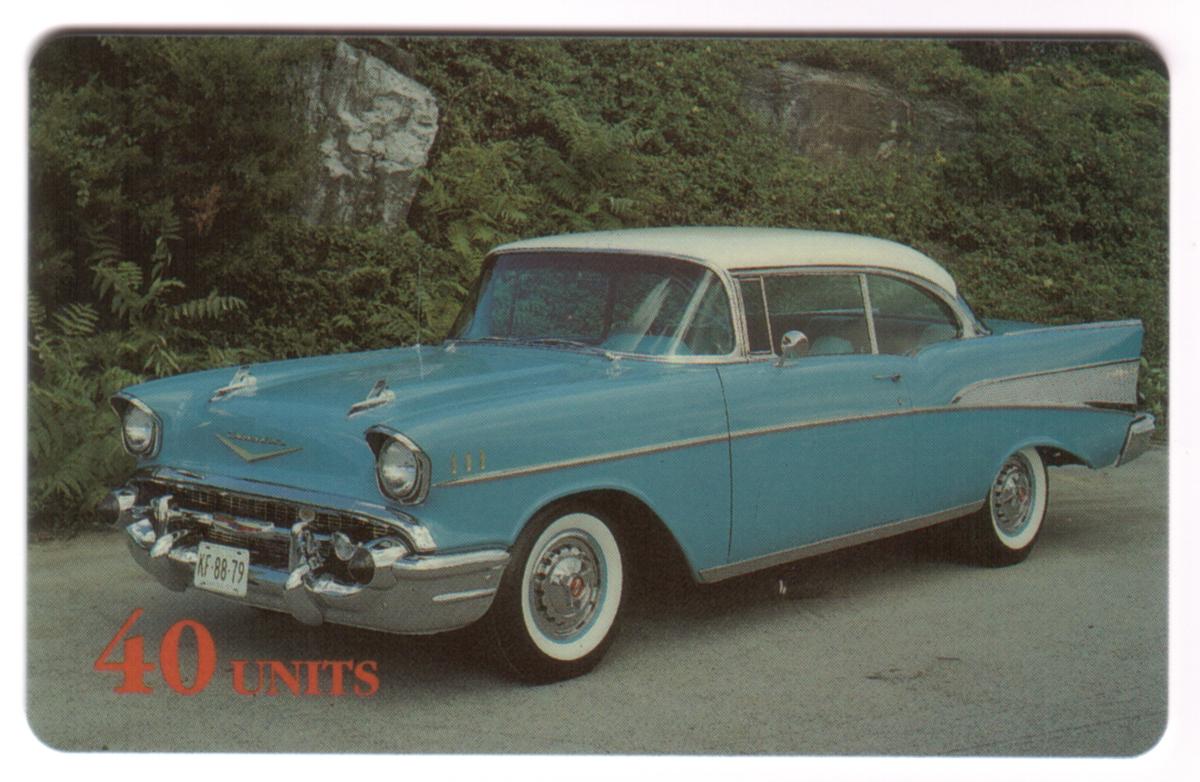 The phone card includes the text "40 UNITS" printed in red on the bottom left corner, indicating its calling units or value. This collectible card highlights automotive history, focusing on classic American cars from the 1960s era, specifically the 1957 Chevrolet Bel Air model, a symbol of iconic car design from the USA and Canada.