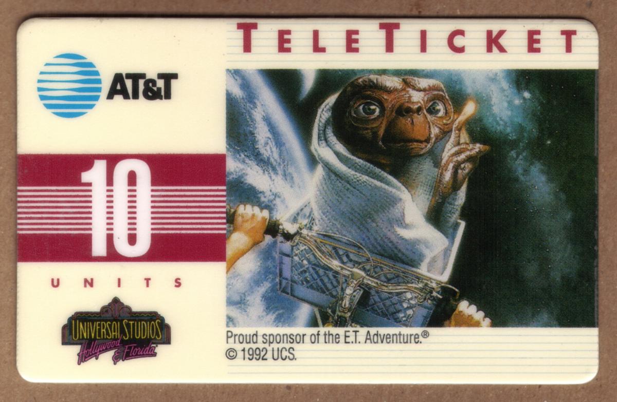 A 1992 vintage E.T. phone card featuring the iconic scene of E.T. in a blanket with glowing finger, starry background, and official Universal Studios branding. |
