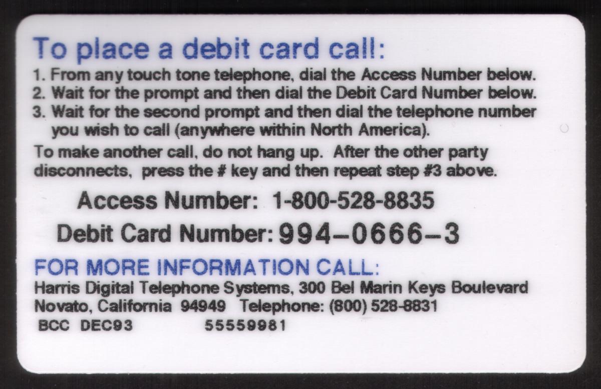 Additional text on the card reads "Complimentary Telephone Debit Calling Card (See reverse side for dialing instructions)," indicating its use as a prepaid telephone debit card. The overall design combines technology branding with a space-themed visual, reflecting Harris Digital Telephone Systems' product identity.