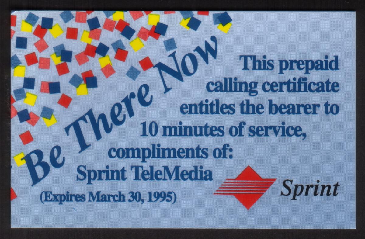 This collectible phone card displays a prepaid calling certificate from Sprint TeleMedia. The card features the prominent phrase "Be There Now" in large, blue italic lettering. It states that the certificate entitles the bearer to 10 minutes of service, provided by Sprint TeleMedia. The expiration date is clearly printed as March 30, 1995.