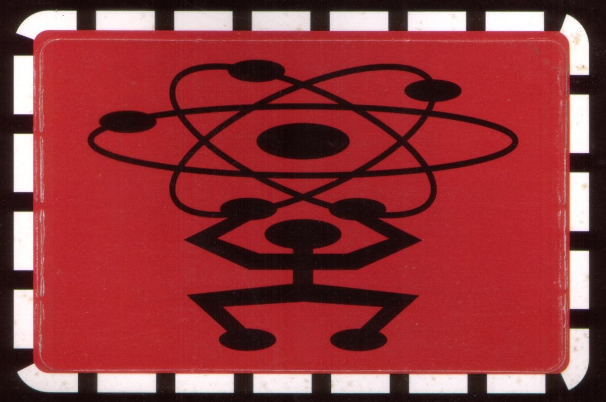 This vintage phone card features bold atomic and human figure imagery on a striking red background, blending art and technology for collectors and enthusiasts. |