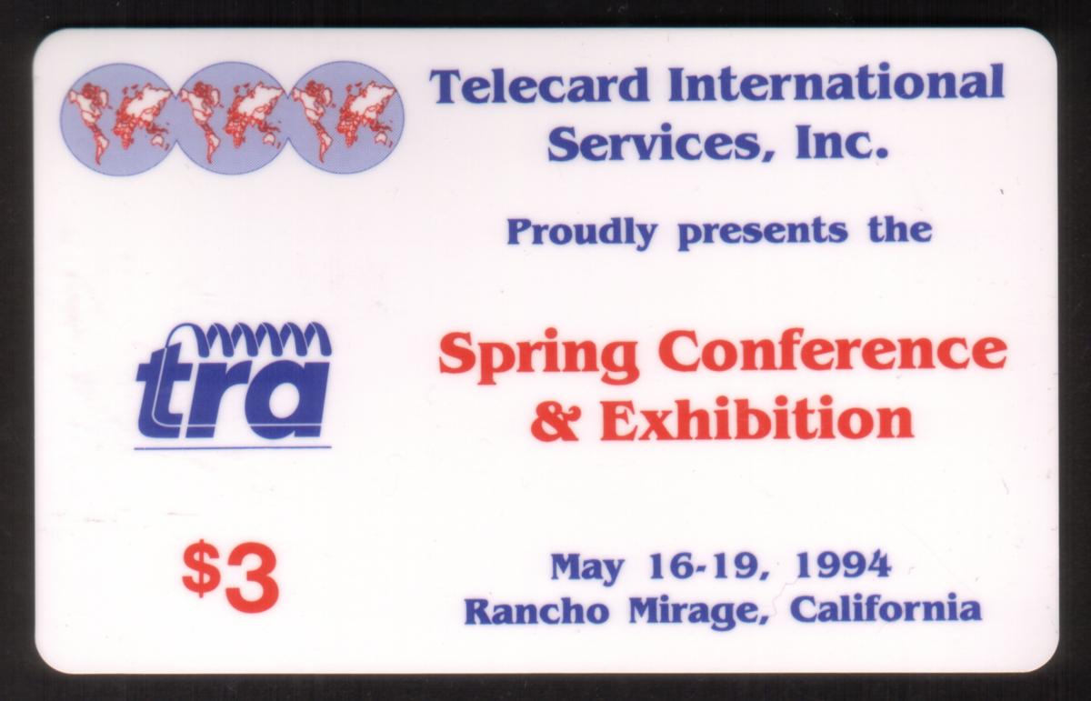 The card commemorates the Telecommunications Resellers Association’s TRA Spring Conference & Exposition Show Card for May 1994, highlighting its connection to this industry event in California. The overall design is straightforward and professional, focused on promoting the TRA event and Telecard International Services, Inc. as the provider.