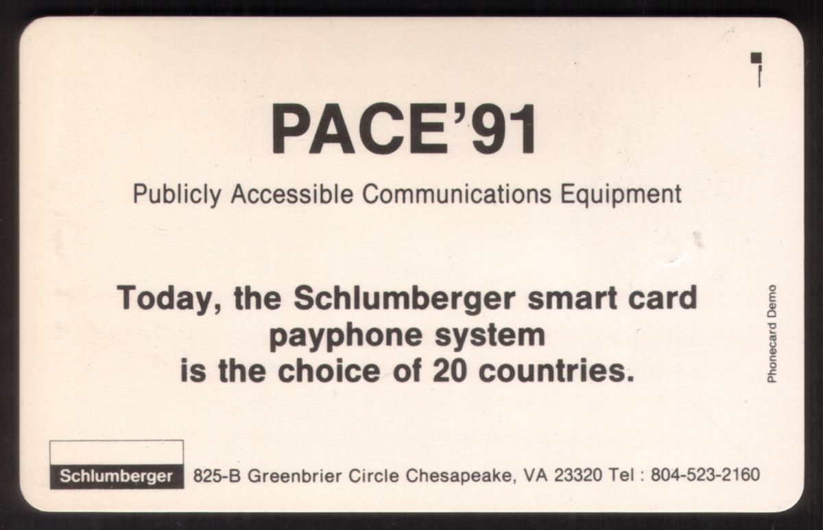 This card is associated with PACE '91, reflecting payphone system installations by Schlumberger and publicly accessible communications equipment. It also references trial use at Lebanon Airport. The visual focus on the world map and identified customer locations worldwide underscores the global reach of Schlumberger’s payphone technology during this period.