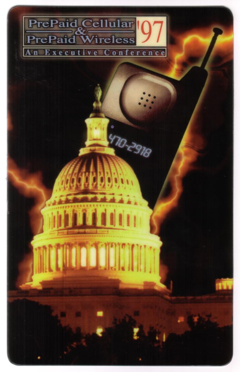 This collectible promotional card from 1997 features a striking image of the United States Capitol Building in Washington, DC. The Capitol is brightly illuminated against a dark sky, emphasizing its iconic dome and architectural details. Above the dome, a large, stylized image of an early mobile phone with an external antenna is shown, symbolizing prepaid cellular and prepaid wireless communication technology. The phone displays the number "470-2918" on its screen.