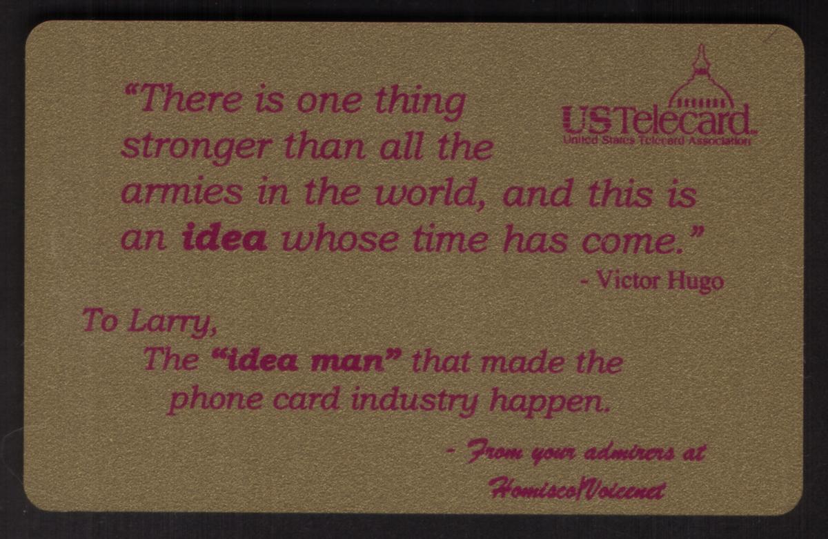 The collectible Telecard features an inspirational quote from Victor Hugo printed in magenta text on a gold background. The quote reads: "There is one thing stronger than all the armies in the world, and this is an idea whose time has come." Below the quote, a dedication to Larry is inscribed, calling him the "idea man" who made the phone card industry happen. The message is signed by admirers at Homisco/Voicenet.