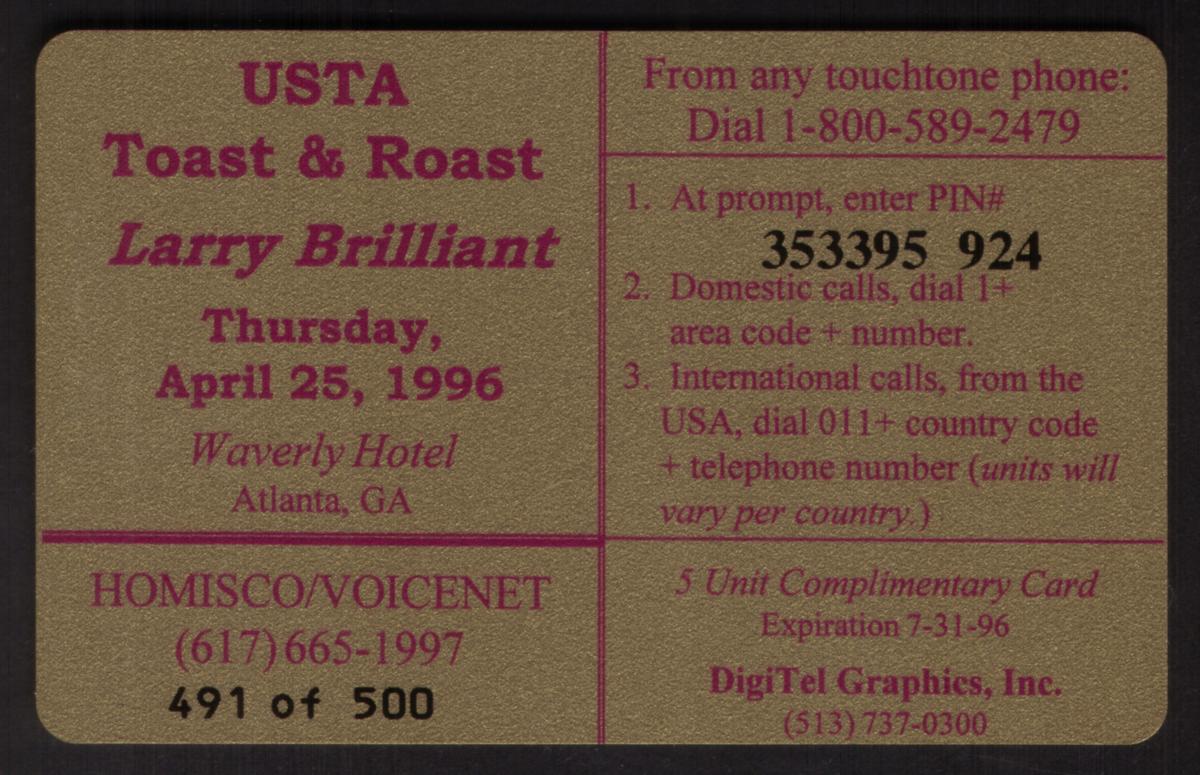 The card prominently displays the logo of the United States Telecard Association (U.S. Telecard) in the upper right corner. This Telecard is associated with the 1996 USTA Toast & Roast event honoring Larry Brilliant’s retirement, held at the Waverly Hotel in Atlanta, Georgia, United States. The card value is marked as 5 units from Digitel Graphics.