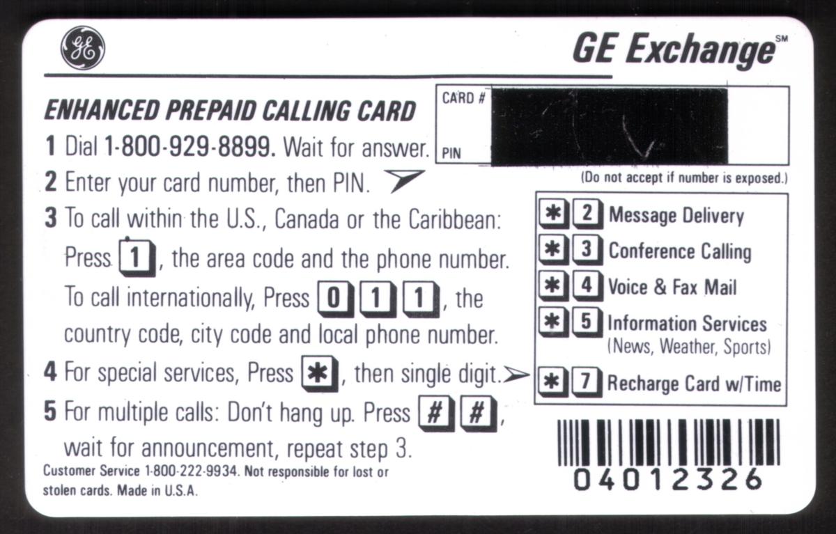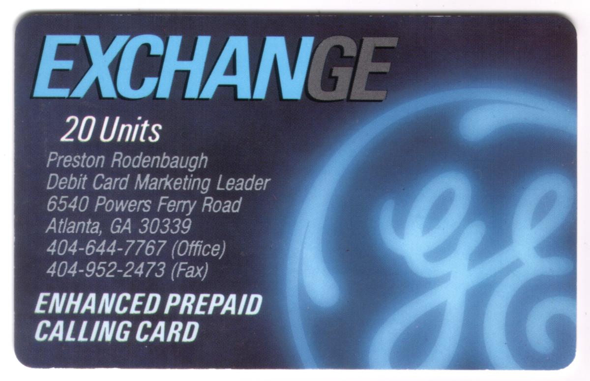 Overall, this card serves as a promotional item for the GE Exchange prepaid calling service, combining corporate branding with direct contact details for a specific marketing leader connected to the debit card program.