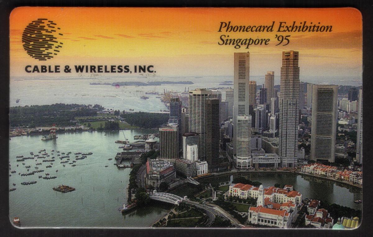 In the top left corner, the card displays the Cable & Wireless, Inc. logo accompanied by the company name in black text. The upper right corner contains the text "Phonecard Exhibition Singapore '95," signifying the card’s connection to the 1995 Singapore phonecard exhibition. The sky transitions from orange yellow near the horizon to a darker gradient toward the top, creating a striking background for the cityscape.