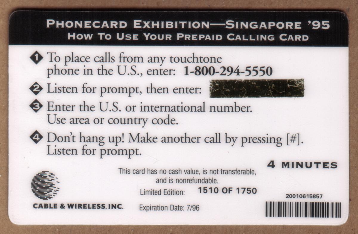 This phone card was issued for promotional purposes connected to the Singapore '95 Phonecard Exhibition. It represents a collectible item showcasing the Singapore skyline as seen from above, emphasizing the city’s modern architecture and its importance as a commercial hub in the mid-1990s.